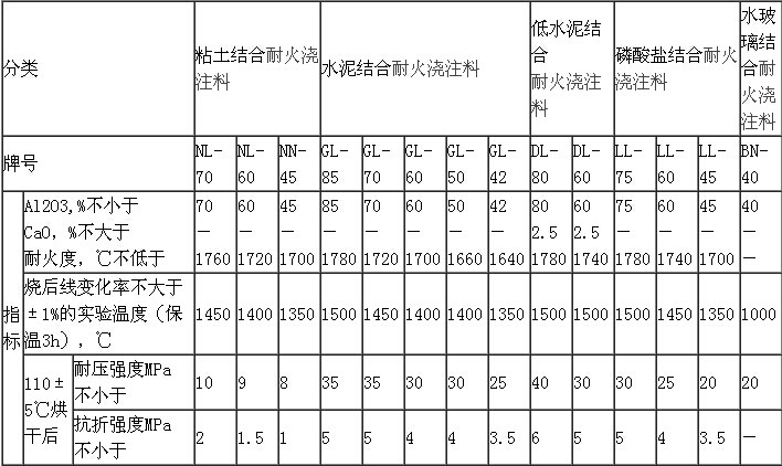 致密耐火澆注料理化指標