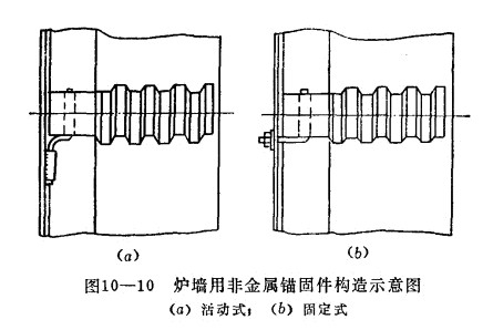 金屬錨固件適應在較低的溫度下工作,以保證整個結構的牢固性。金屬錨固件不宜采用低碳鋼,應盡量采用合金鋼,非金屬錨固件,可采用高鋁質或粘土質制品,視溫度的高低而定。無論采用哪種形式的錨固件,其熱膨脹值應盡可能與錨固對象相近。