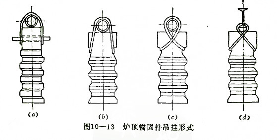 爐頂錨固件:平式爐頂宜采用吊掛錨固構造形式,可與爐墻完全分開。錨固件的分布,一般為規(guī)則排列,其行間中心距為360*460毫米。再大時,錨固件易損壞;如太小,則施工不便。爐頂錨固件多采用非金屬的,要吊直,不可偏斜,否則會因扭矩作用而使錨頸斷裂,甚至造成爐頂塌落。錨固件與工字鋼或圓鋼管的連接,可采用合金圓鋼,金屬鑄件或普通鋼。如采用金屬錨固件時,伸入耐火混凝土中的端部與受熱面的距離應大于30毫米。最常用的爐頂錨固件吊掛形式,如圖所示。