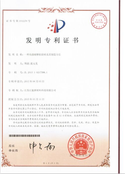 日前,江蘇江能新材料科技有限公司一項發(fā)明專利獲得國家知識產(chǎn)權(quán)局授權(quán),此項專利名稱為“一種高強(qiáng)耐磨抗侵磚及其制造方法”,專利號為ZL 2013 1 0217588.1。