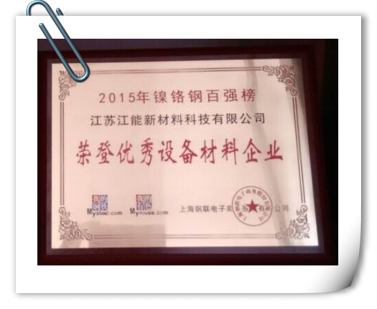 今日,江蘇江能新材料科技有限公司收到了上海鋼聯電子商務股份有限公司快遞送來的 “2015年鎳鉻鋼百強榜優秀設備材料企業”榮譽稱號的獎牌。據了解,本行業只有少數企業獲得該項榮譽,我公司是其中之一。