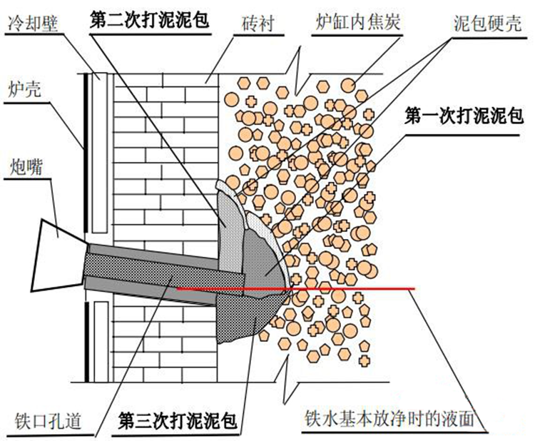 當(dāng)爐墻受到侵蝕鐵口特別淺時(shí),首先需要知道鐵口實(shí)際深度,通過(guò)鐵口實(shí)際深度,確定鐵口孔道填充所需要的基本打泥量和生產(chǎn)泥包所需要的打泥量,然后利用“分階段打泥”的操作方法,控制打泥量、停頓次數(shù)和停頓時(shí)間。第一次打泥量必須仍然按照鐵口孔道實(shí)際深度體積的 3~5 倍的數(shù)量控制打泥,千萬(wàn)不能因?yàn)殍F口過(guò)淺而打泥過(guò)多,停頓時(shí)間必須延長(zhǎng)到最大限度,給“泥包”“結(jié)殼”和水分蒸發(fā)或者揮發(fā)份揮發(fā)留出足夠時(shí)間,為了使鐵口“泥包”牢固和穩(wěn)扎穩(wěn)打地把鐵口深度恢復(fù)上去,其打泥停頓次數(shù)或者說(shuō)打泥次數(shù),可以增加到 4 次甚至 5 次,但總打泥量必須控制在鐵口孔道實(shí)際深度體積的 8 倍以內(nèi),打泥過(guò)多或者“漲鐵口”心切,往往適得其反。