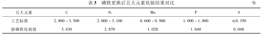 針對(duì)磷鐵成分中硫含量高出標(biāo)準(zhǔn)值4.5倍的問(wèn)題,借鑒同行業(yè)做法,整體置換磷鐵,選用專(zhuān)業(yè)鐵合金公司配置標(biāo)準(zhǔn)磷鐵予以置換。經(jīng)過(guò)整體更換磷鐵后,五大元素完全符合工藝標(biāo)準(zhǔn)要求,見(jiàn)表3。鐵水流動(dòng)性得到很大改善,不但陽(yáng)極澆鑄后磷鐵環(huán)平整、飽滿(mǎn),外觀質(zhì)量得到根本性轉(zhuǎn)變,更重要的是鐵水出爐溫度只需1350℃即可滿(mǎn)足澆鑄需求,爐襯工作溫度大幅下降,爐齡得到保障,中頻爐爐齡平均為57天。