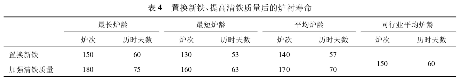 為了使更新的磷鐵成份保持長(zhǎng)周期穩(wěn)定,減少爐渣的產(chǎn)生,降低雜質(zhì)對(duì)爐壁的腐蝕,也為了提高陽(yáng)極澆鑄質(zhì)量創(chuàng)造條件,在更新磷鐵后要堅(jiān)持對(duì)回爐鐵進(jìn)行清理后才能入爐熔煉。因?yàn)榛貭t鐵表面除了附著部分殘極碳粒,還有電解質(zhì),這些雜質(zhì)對(duì)爐襯來(lái)說(shuō)都是有害元素,其中碳粒和石英砂在高溫下發(fā)生還原反應(yīng)(SiO2+2C=Si+2CO),而電解質(zhì)作為堿性物對(duì)酸性爐襯同樣具有腐蝕作用,從而破壞爐襯影響爐齡。通過(guò)提高磷鐵清理質(zhì)量,使?fàn)t齡在原有基礎(chǔ)上再次延長(zhǎng)10~15天,爐次增加30次,見(jiàn)表4。