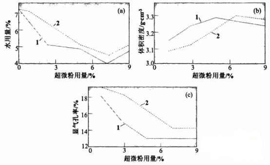 超微粉作用機理是復雜的。超微粉品種的不同,其作用機理也有區(qū)別。在耐火澆注料中,超微粉的基本作用機理是填充傳統(tǒng)耐火澆注料的耐火骨料和粉料級配,雖然堆積密度較大、也較致密,但仍有眾多的孔隙被過量的水填滿,水樣除后,留下許多孔隙;當采用超微粉后,這些孔隙被超微粉填充,極少量的微孔被水填滿。這樣,耐火澆注料的拌和水量降低,成型體中的水排除后,留下的孔隙也較少。這就是說,在耐火澆注料中,摻加超微粉可降低拌和用水量,同時能提高體積密度和降低顯氣孔率。圖1為超微粉用量與水用量、體積密度和顯氣孔率的關系。耐火澆注料的配比為(%):8~0.088mm的白剛玉骨料65,<0.088mm的白剛玉粉31.9,Ca-70水泥3,分散劑0.1,摻加超微粉后保持粉料量不變。