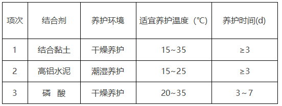 表1 耐火澆注料的養(yǎng)護(hù)制度